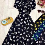 استمتعي بجمال آسر مع هذا الفستان الطويل والساحر. يتميز الفستان بلونه الأسود الأنيق الذي يعكس الرقي، والمزين بنقشة فراشات بيضاء متناثرة تضفي عليه لمسة من الرقة والجاذبية. ياقة الفستان على شكل حرف V مع تفاصيل كشكشة ناعمة، وأكمام قصيرة وواسعة توفر الراحة. يحدد الخصر حزام قماش رفيع يبرز القوام بشكل أنيق، بينما ينسدل الفستان بقصة واسعة ومريحة تمنحه انسيابية وحركة. هذا الفستان مثالي للارتداء اليومي، الزيارات، أو أي مناسبة تتطلب إطلالة أنيقة ومحتشمة
