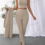 تميزي بإطلالة أنيقة ومريحة في نفس الوقت مع هذا الطقم النسائي الثلاثي العصري. يتكوّن من توب بدون أكمام بقصة ضيقة، وبنطلون بنفس التصميم المطاطي المريح، وجاكيت طويل مفتوح يُضفي لمسة راقية على الإطلالة.