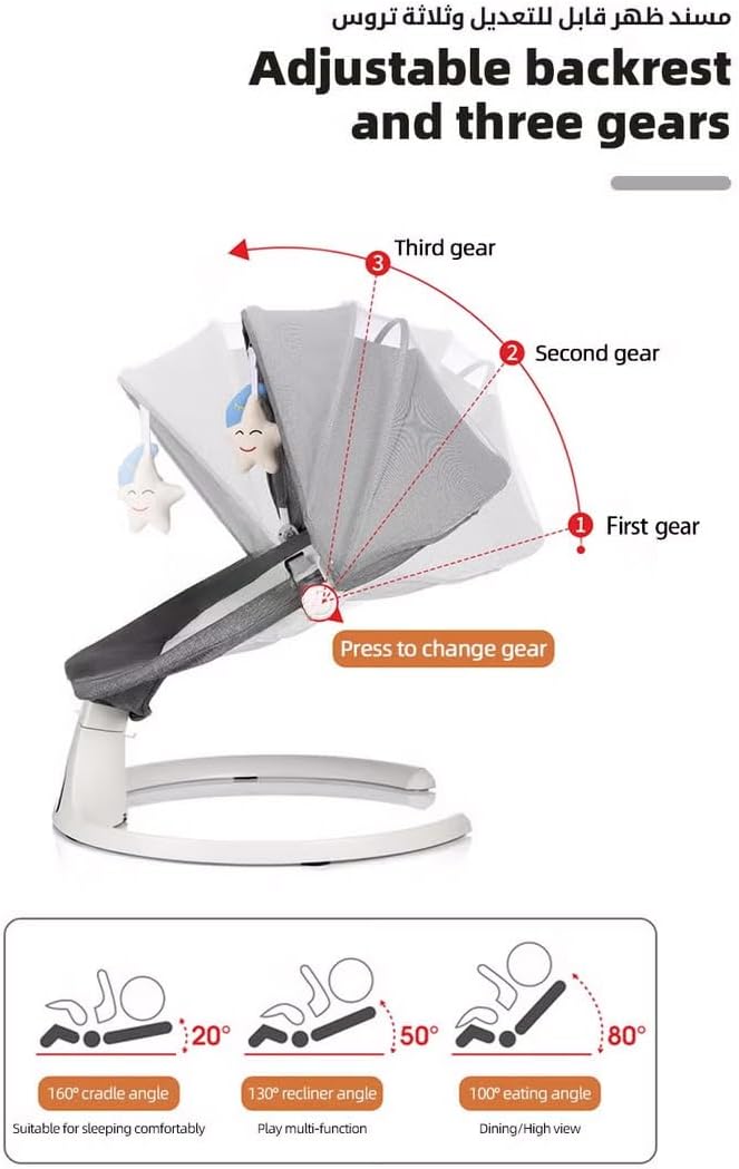 إطلاق العنان لتعدد الاستخدامات: قم بتعديل الكرسي الهزاز ليناسب مزاج طفلك من خلال 5 أوضاع للتأرجح. ابحث عن الإيقاع المثالي لتهدئة طفلك الصغير في نوم هادئ أو إبقائه مستمتعًا بهزه بلطف أثناء اللعب.