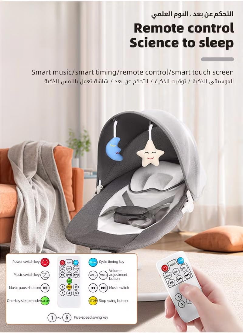 الراحة عن بعد: يمكنك التحكم في الكرسي الهزاز بسهولة باستخدام جهاز التحكم عن بعد المتضمن. اضبط أوضاع التأرجح واضبط المؤقتات وقم بتغيير الموسيقى دون إزعاج طفلك الصغير. استمتع براحة إدارة راحة طفلك عن بعد.